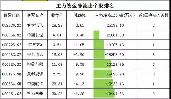 资金净流出的个股中,科大讯飞、中国长城净流出超过2亿元,神雾节能、美都能源跌停,资金净流出均超过1亿元。