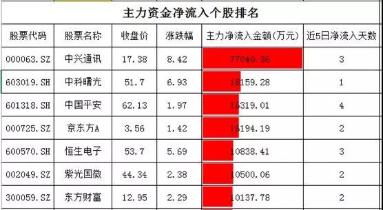 麟龙投顾指出,个股资金净流入方面,净流入规模相对前几个交易日有些向好的改善,中兴通讯净流入超过7.7亿元,中科曙光净流入超过1.8亿元,中国平安、京东方A净流入超过1.6亿元。