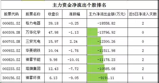 资金净流出的个股中,格力电器净流出超过1.8亿元,万华化学、三安光电净流出超过1.2亿元,华菱钢铁、神雾节能和塔牌集团净流出超过1亿元。
