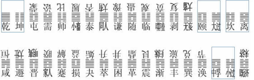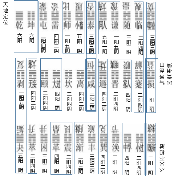 泰(否)与咸(恒)为相邻的两节中(竖排)阴阳爻数互补的卦象(组),噬嗑(贲)与损(益)、剥(复)与夬(逅)、无妄(大畜)与萃(升)、咸(恒)与丰(旅)、损(益)与既济(未济)亦然。这意味着前后节为一个整体。