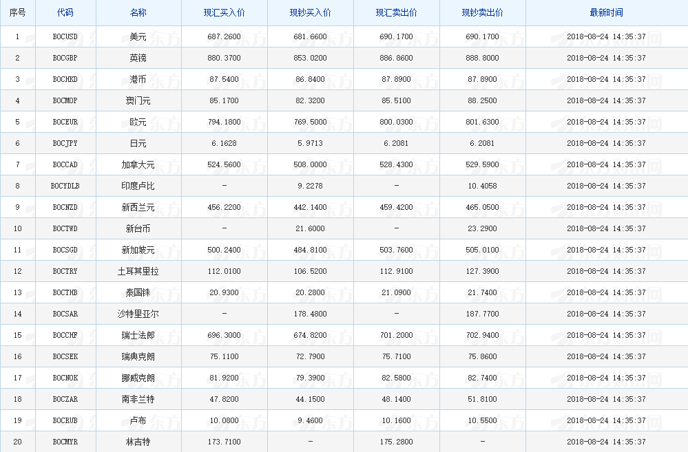 中国银行外汇牌价 2018-08-24(图片来源:东方财富网)