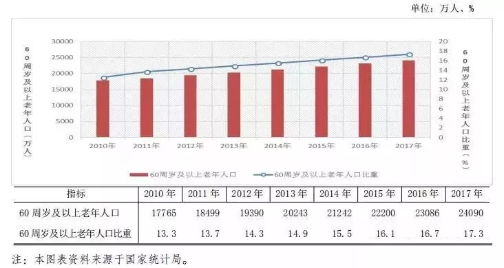 统计公报中:不提供住宿的老龄服务。截至2017年底,全国60周岁及以上老年人口24090万人,占总人口的17.3%,其中65周岁及以上老年人口15831万人,占总人口的11.4%。全国共有老龄事业单位1600个,老年法律援助中心2.0万个,老年维权协调组织6.4万个,老年学校4.9万个、在校学习人员704.0万人,各类老年活动室35.0万个;享受高龄补贴的老年人2682.2万人,比上年增长13.9%;享受护理补贴的老年人61.3万人,比上年增长51.5%;享受养老服务补贴的老年人354.4万人,比上年增长25.3%。
