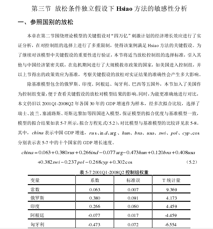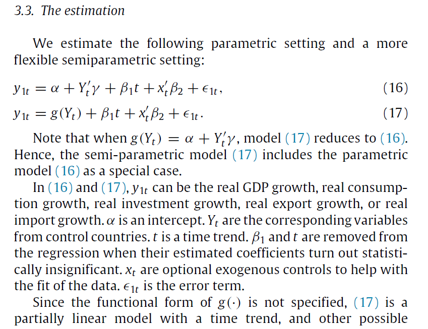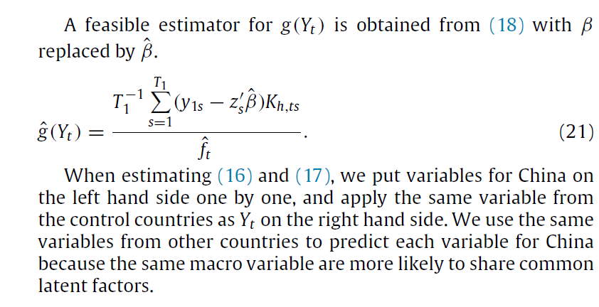 Min Ouyang与Yulei Peng回到最初的HCW框架(2012)。 HCW(2012)方法依赖于误差项的条件均值是潜在因素的线性函数的关键假设(假设六);否则OLS估计的一致性不能建立。通过允许条件均值具有半参数设置,他们放宽了这个假设。 因此,在没有2008年经济刺激方案的情况下,他们采用HCW框架来估计中国的实际宏观经济效果。在选择控制组经济体时,他们要寻找那些不仅与中国经济显示出强相关性,而且相对独立于2008年刺激方案处理后的那些经济体。更具体地说,他们考察了中国和潜在的控制经济体之间的贸易关系。与中国的贸易总额仅占本国GDP很小一部分的经济体,应该相对独立于中国实施的任何政策干预。因此,他们维持HCW(2012)的一个重要假设,政策干预必须对控制组保持外生性。根据HCW方法,通过假设因子模型的形式,构建模型,作者通过计算与中国的贸易量占这个国家GDP的比重来挑选进入Y_t的国家,最终选出斯洛文尼亚、法国和爱沙尼亚三个国家作为控制组。