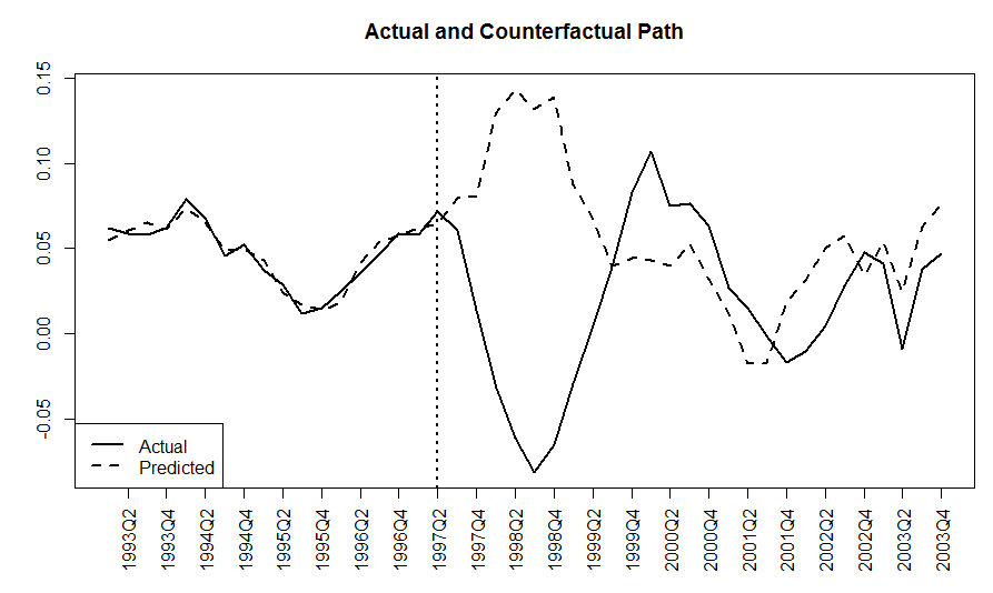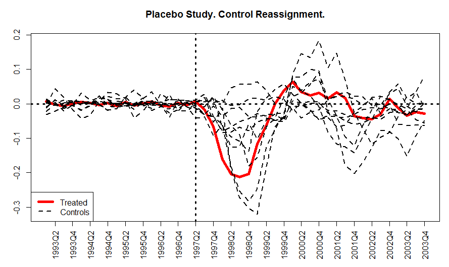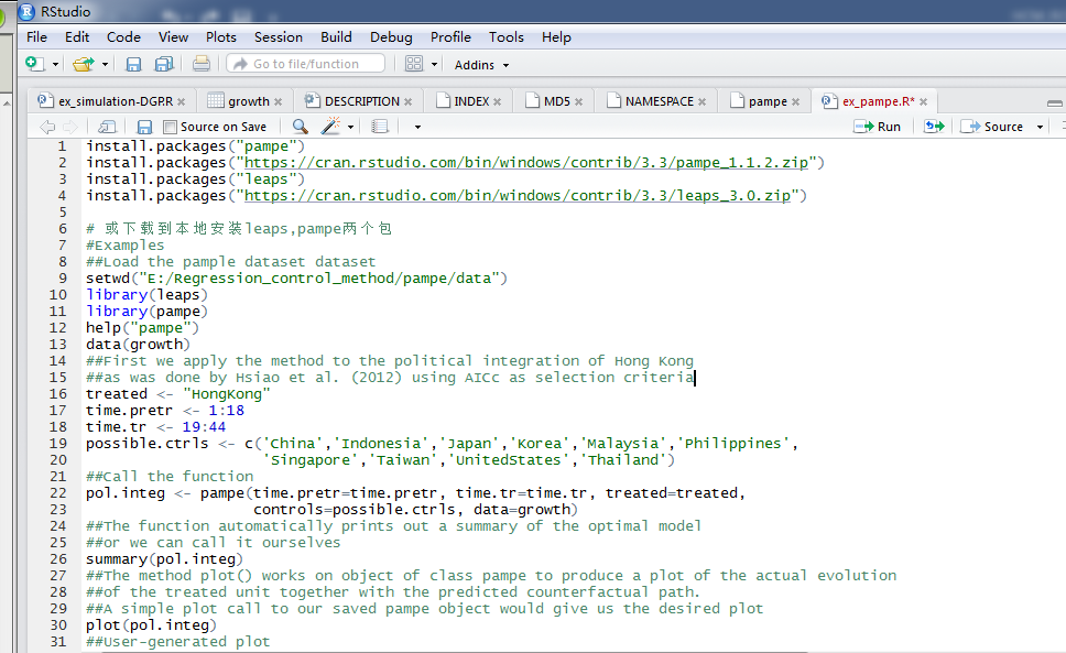 Vega-Bayo发展了一个复制Hisao等(2012)文章的R语言包,我们将略介绍并将在文末提供下载。Vega-Bayo A. An R Package for the PanelApproach Method for Program Evaluation: pampe[J]. R Journal, 2015.