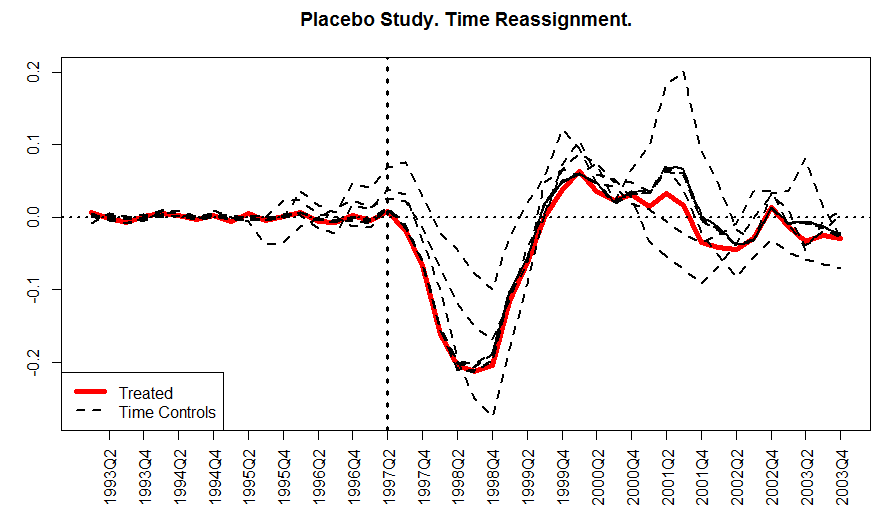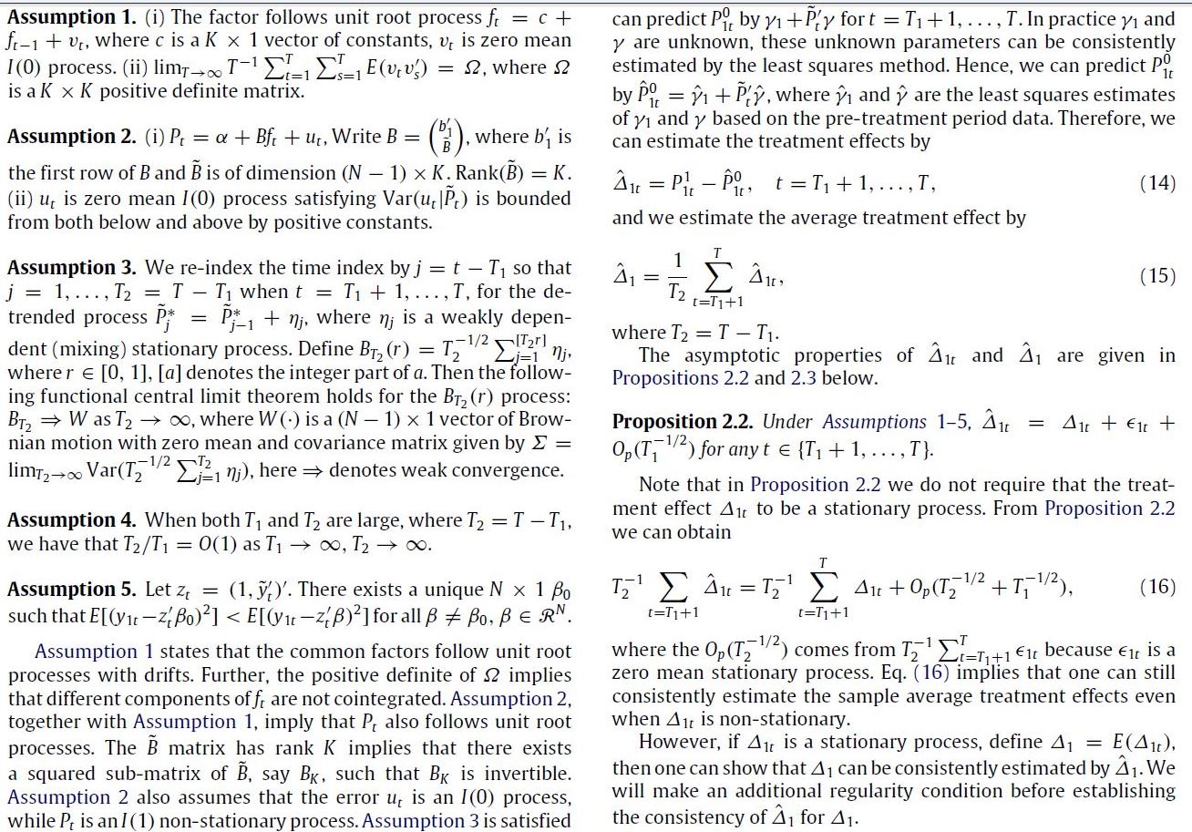 有多种方法来构造具时变潜在因素的反事实。 如Bai和Ng (2002)所建议的一个可以估计潜在因素的模型。不幸的是,这种方法只在横截面和时间序列维度都足够大的情况下才适用,这在评估宏观政策时很少发生。或可通过估计VAR模型来执行时间序列预测。但是VAR预测不能包含任何后处理冲击,因为它的预测超出了样本。 另外,可以使用不在政策干预下的一组区域的数据变化来控制时变的潜在因素。这就是通常的双重差分法(以下简称DID) (Card and Krueger,1994). 然而,DID受到许多假设限制:首先,处理分配必须是随机的(没有选择偏倚);第二,处理和控制区域必须具有相同的潜在因素;第三,共同的潜在因素必须在每个组上具有相同的数量影响,所以,可以采取差分消除这些影响。 这些假设在应用工作中很难维持,因为在现实中,决策者对处理区域的选择从来都不是随机的。最重要的是,地区在人口、文化、经济和政治制度方面不同,因此大多数潜在因素及其影响确实存在于不同横截面。未能纳入这样的横截面异质性可导致严重有偏的估计。也可使用Abadie,Gardeazabal (2003) 和 Abadie, Dimond, Hainmueller (2010)提出的合成控制方法去估计平均处理效应。合成控制方法放宽了DID法的等权重约束。然而,当处理单元和控制单元表现出不同的趋势行为时(在没有处理的情况下),合成控制方法可能导致样本拟合很差,在这种情况下,不应使用合成控制方法(Abadie,Dimond,Hainmueller 2010,第495页)。