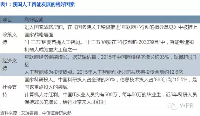 我们认为,目前较为成熟的感知智能技术(如语音、视觉识别的服务、硬件产品等)的应用开发所形成的新“人工智能+”将引领产业变革,成为推动社会飞跃发展的新动力。在传统产业,人工智能可以在制造业、农业教育、金融、交通、医疗、文体娱乐、公共管理等领域得到广泛应用,将不断引入新的业态和商业模式;在新兴产业,人工智能还可以带动工业机器人、无人驾驶汽车、VR、无人机等处于产业生命周期导入期的公司飞跃式发展。从具体应用方向来看,如今十分火热的工业4.0、人脸识别、智能答题机器人、智能家居、智能安保、智能医疗、虚拟私人助理等人工智能概念是有望得到快速爆发的重点领域。