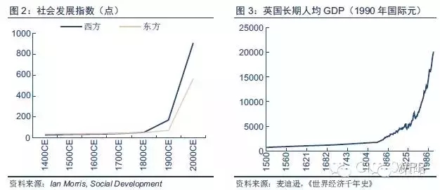 从劳动生产率角度来看,在历史的长河中,仅有的两次劳动生产率飞跃式提高都是技术进步带来的结果。以蒸汽机为代表的第一次工业革命的广泛应用之后,劳动生产率才出现了快速的上升;而在第三次技术革命时期,上升的速度更快。在工业革命席卷各国之前,长期以来人均产出或劳动生产率的提升是很难观测到的,如图2所示,在工业革命之前,英国人均GDP的增长十分缓慢,而工业革命之后,这一指标迅速上升。如图3,根据Ian Morris测算的社会发展指数,工业革命也是西方率先走向现代化并长期领先东方的重要因素。工业革命带来了生产方式、交通运输、国际贸易、甚至是社会阶层和全球力量格局的变化。历史学教授Gregory Clark认为:“人类历史中其实只发生了一件事,即1800年前后开始的工业革命。只有工业革命之前的世界和工业革命之后的世界之分,人类其他的历史细节有意思,但不关键”。