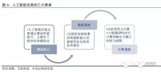 人工智能的产生具有坚实的科学理论基础。算法、数据和计算三大基础要素共同驱动人工智能发展。其中算法是机器实现人工智能的核心,计算能力和大数据是人工智能的基础。一直以来人工智能突破主要依赖于算法性能的提升,近年来主要有工程学法和模拟法实际应用在人工智能技术中,推动人工智能开始发展至感知智能阶段。而随着第三次技术革命以来计算机、互联网在数据生成、采集、存储、计算等环节的突破,为人工智能进入高速发展阶段提供了坚实的基础。
