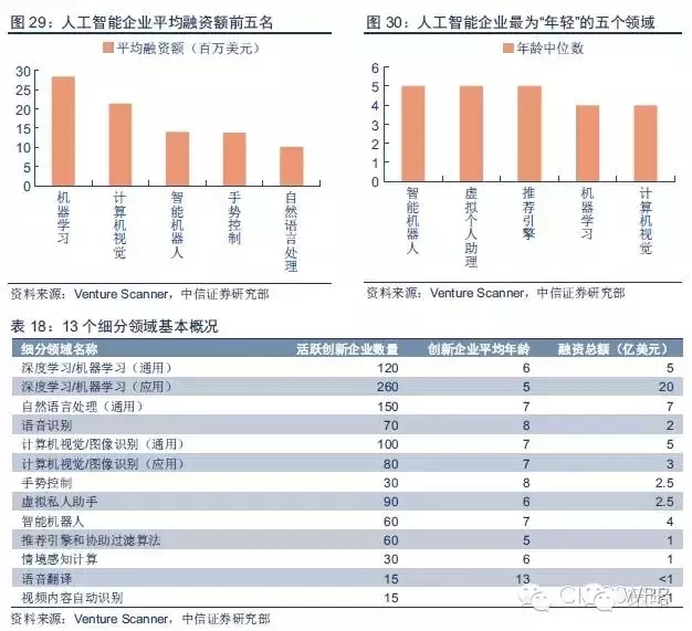 从投资回报率和产业成熟度来看,机器学习、图像识别、智能机器人仍然是最受产业资本青睐的三个细分领域。众所周知,风投公司倾向于将资金流向投资回报率最高的新兴产业,对比人工智能领域的风险融资额度能够很好地反映该领域的投资回报率。VentureScanner公司的调查数据显示:无论从总体融资额度还是企业平均融资额度,机器学习都牢牢占据榜首;图像识别领域的总体融资额度和企业平均融资额度紧随其后;而智能机器人领域由于公司数量较少,在融资总量上稍有落后,但其企业平均融资额度高达1400万美元,仅次于机器学习和图像识别领域。此外,从各领域公司创办时间而言,机器学习、图像识别以及智能机器人也是最为“年轻”的三个领域之一,产业内技术成熟度还不够高,未来几年将提供广阔的蓝海市场。