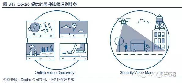 举例来说,一家初创公司Dextro正在开发能够进行视频识别的软件并凭借这个产品,成功进入了2015年在线视频企业Top15。Dextro主要运用深度学习算法进行视频分析,它们正在开发的平台SSM(Sight,Sound&Motion)可以帮助用户寻找最有新闻价值的视频。Dextro目前提供两种服务,一种是在线视频搜索,即像文字搜索一样寻找、解释和分类视频,可以用于提升视频编辑剪辑工作效率和实现视频与广告的智能匹配;另一种是监控视频管理,能够快速锁定监控视频中的图像,可以用于家庭智能安保、城市空间布局分析和犯罪分子识别等领域。