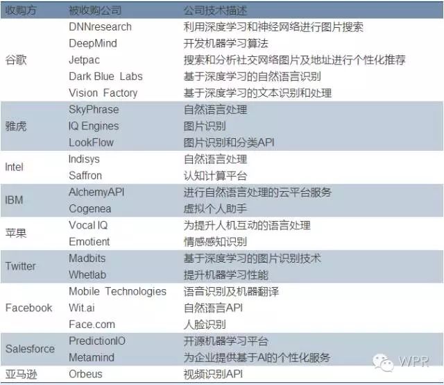 谷歌作为人工智能领域的领头羊进行了5次至关重要的收购,涉及深度学习、推荐引擎、图片搜索等多个技术领域,值得一提的是,近期战胜韩国棋手李世石的AlphaGo是2014年谷歌花费4亿美元收购的英国初创公司DeepMind所创造的。而据彭博社报道,亚马逊于2015年秋季秘密收购了硅谷初创公司Orbeus,该团队专注于人脸识别技术,其核心产品ReKognition能够自动分类和辨别照片中的内容,目前的识别对象可以包括人脸、场景、陆标、物体等其他概念。Orbeus的照片软件PhotoTime不仅早于谷歌发行的基于人工智能的应用,其使用的图像识别算法也比Facebook先前收购的Face.com更加细致。