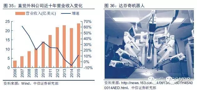 美国直觉外科公司正是凭借其王牌产品达芬奇机器人在10年间一举扩张成为全球最优秀的医用机器人公司。达芬奇机器人目前世界上最成功的手术机器人系统,它是为外科医生手术操作中提供直观的控制运动、精细组织操作和三维高清晰度视觉能力而设计的,同时允许外科医生进行微创手术。达芬奇机器人由三部分组成:外科医生控制台、床边机械臂系统、成像系统。实施手术时主刀医师不与病人直接接触,通过三维视觉系统和动作定标系统操作控制,由机械臂以及手术器械模拟完成医生的技术动作和手术操作。目前美国FDA已经批准将达芬奇机器人手术系统用于成人和儿童的普通外科、胸外科、泌尿外科、妇产科、头颈外科以及心脏手术。得益于世界市场对医用机器人的持续认可和需求增长,直觉外科公司在过去的10年里规模快速扩张,营业收入复合增长率达30%,达芬奇机器人使用范围复合增长16%,使用频率达52.3万次。