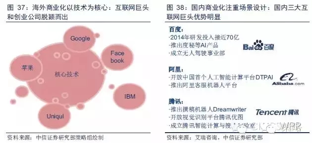 海外AI商业化应用:将技术开发拓展到商业领域,拥有核心技术的互联网巨头和创业企业最容易脱颖而出。海外AI的商业化注重技术开发,基于大数据基础、算法优化来提高技术水平进而再把技术开发拓展到商业化领域:以技术为核心,商业化则是再进一步的必然结果,一般来说商业化的项目都是其在技术技术领域已经达到足够多的积累之后才发生的。具体来看:1)Facebook,围绕大数据挖掘的技术核心,建造能够理解海量数据的人工智能机器,通过挖掘用户数据信息为用户推荐其更为喜欢的浏览内容;2)苹果,基于语音识别的核心技术,开发人工智能语音系统Siri,用户通过语音对话对苹果下指令;3)Uniqul,基于人脸识别技术,最早推出了人脸识别支付技术,推进AI与金融相结合的商业模式发展;4)Bettermen,建立个人投资管理平台,只要在Betterment平台上,回答几个关于你的投资目标的问题,Betterment会根据你的回答做分析给出相应的投资组合建议,并通过平台直接投资。