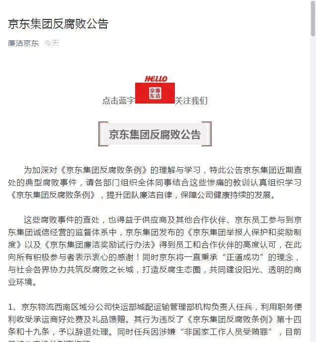 公告称,为加深对《京东集团反腐败条例》的理解与学习,特此公告京东集团近期查处的典型腐败事件,请各部门组织全体同事结合这些惨痛的教训认真组织学习《京东集团反腐败条例》,提升团队廉洁自律,保障公司健康持续的发展。
