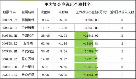 资金净流出的个股中攀钢钒钛复牌大涨,资金净流出超过3.6亿元,中兴通讯净流出超过3.6亿元。中国软件净流出超过2.1亿元。昆仑万维、八一钢铁大跌,资金净流出超过1.2亿元。