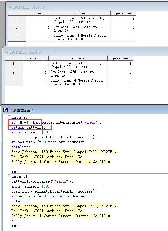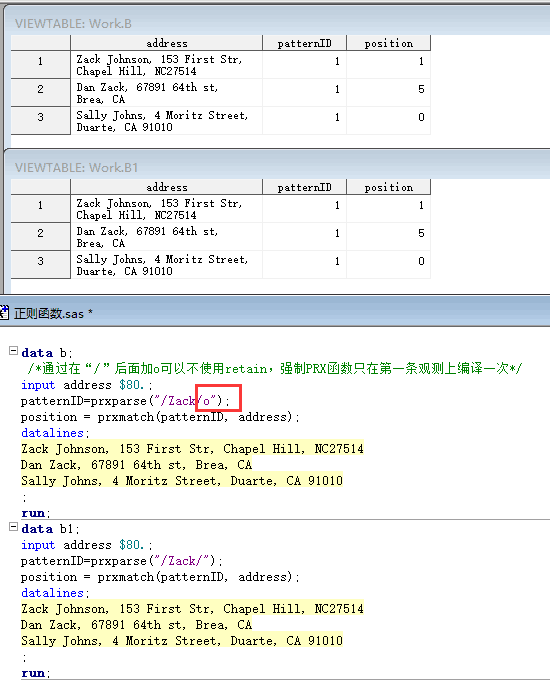 之前看过某论坛上写的正则函数prxparse()返回的是逻辑值1或0(查询到字符返回1,未查询到字符返回0),所以写的时候一直retain观测_N_=1的值,或者会在后面加“/o”;但是今天偶然发现即便不这么写,结果也没什么区别,各位有懂得可以解答一下吗 ?两种方式的程序及结果见图:红框的部分好像可以不加