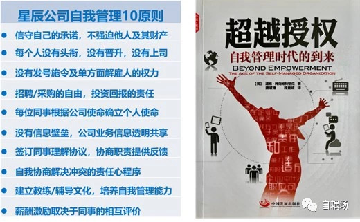 于是,鲁弗从这两个核心假设出发,推导出其他9个自我管理原则(如下图,在笔者与沈竟成先生翻译的《超越授权》中有详细的描述),并在这是个原则的基础上制定了一系列制度,通过管理层和员工的充分参与和讨论进行了企业变革,最终将晨星原来的金字塔式的管理模式转型为完全扁平化的自我管理模式。
