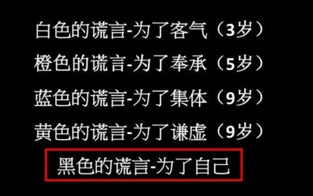 第四种是为了谦虚而说的黄色谎言。比如说,数学考试你明明考了100分,却对同学说考得不好,还需要努力。9岁的孩子就已经开始说黄色的谎言了。