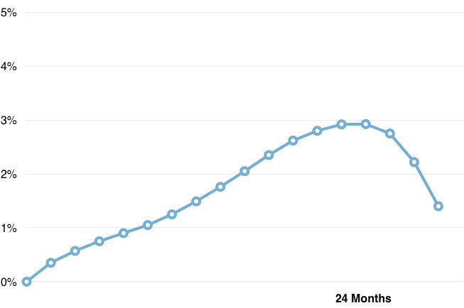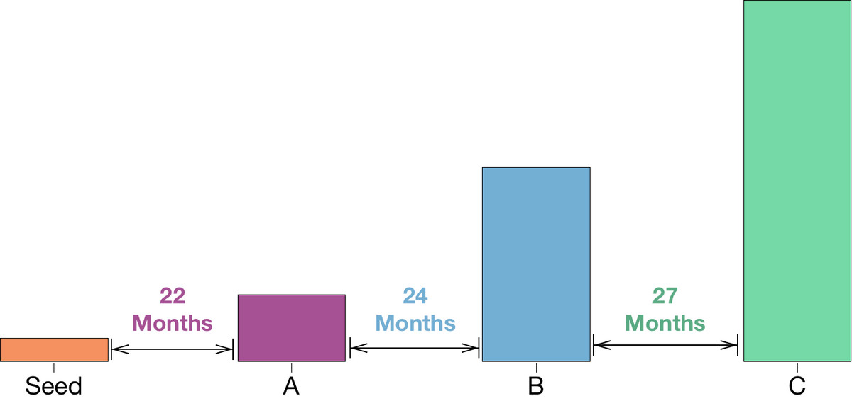 可以看出,在24个月内这一可能性将会达到最大值(包括所有轮投资)。这就意味着创始人需要筹集两年的资金来最大化这一可能性,同时保证完成每一次里程碑式的进度。
