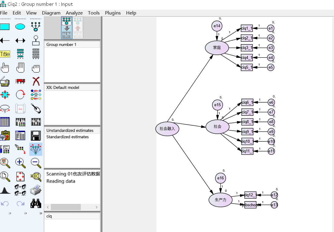 模型不能识别,“社会融入“是潜在变量 要增加观察变量。若“社会融入“是观察变量,要把椭圆换成长方形,这样就变成了混合模型。