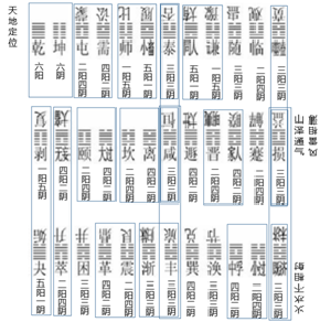 如将36种卦象一分为六,则第一节首卦象组为乾坤,代表天地定位;第二节首卦象为泰(否),为天地相重的卦象;第三节首卦象为剥(复),五阴而类地;第四节首卦象为咸(恒),为泽山(雷风)相重的卦象;第五节首卦象为夬(逅),五阳而类天。