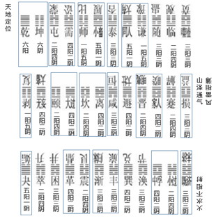 4、在三分36卦象时,乾与坤为同一节中(横排)阴阳爻数互补的卦象对,屯(蒙)与需(讼)、师(比)与履(小畜)、同人(大有)与谦(豫)、颐与大过、坎与离、晋(明夷)与家人(睽)、革(鼎)与震(艮)、渐(归妹)与丰(旅)、中孚与小过亦然。共10个卦象对,含32卦。