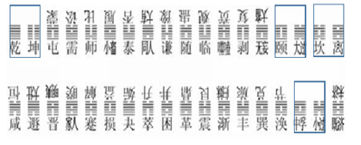 概而言之,六阳六阴的卦象各1个,故其组合起来的“阴阳爻数互补的卦象对”有且只有1个,在《周易》通行本中置于首节首卦象组的位置;五阳一阴与一阳五阴的卦象各3个,故组合起来的“阴阳爻数互补的卦象对”有且只有三个,在《周易》通行本中横排出现了2个、竖排出现了1个;四阳二阴与二阳四阴的卦象各有9个,故组合起来的“阴阳爻数互补的卦象对”至多可以有9个,在《周易》通行本中横排出现了6个、竖排出现了1个(且无重的卦象);三阳三阴的卦象共10个,故其“三连组合的卦象对”至多有3个,在《周易》通行本中竖排出现了2个(另“两连组合”的卦象对出现了1个,其中有一个卦象在三连组合卦象对中重复了)。由前图可知,六阳六阴、五阳一阴、一阳五阴的卦象没有“不互补的”,四阳二阴与二阳四阴的卦象各有2个“不互补的”(构成了两个“前后节(竖排)阴阳爻数相同的卦象组合”),三阳三阴的卦象有3个“不互补的”。