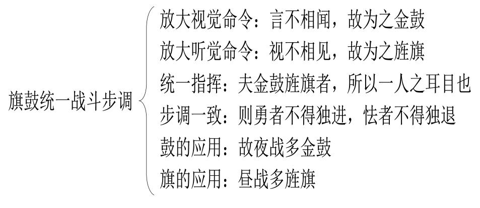 【详解】这章讲旗鼓统一战斗步调。旗是放大了的视觉命令,鼓是放大了的听觉命令,通过放大命令,就能将指挥的范围扩大。旗鼓是指挥系统,为了使整个军队步调一致,这样才能发挥最大力量(如图8所示)。