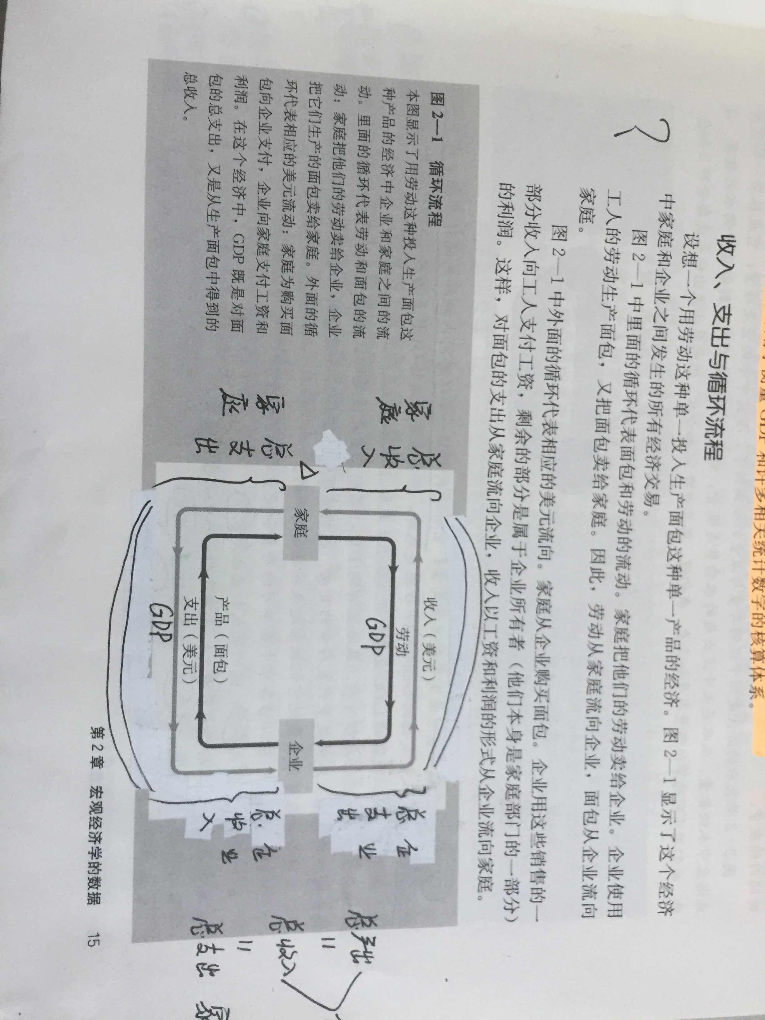 1.这张图,书上写道GDP用两种方式核算,上半部分的总收入或者是下半部分的总支出,显然,收入和支出都是站在家庭的角度来度量的。