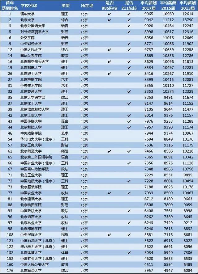 北京高校毕业生薪酬排行: