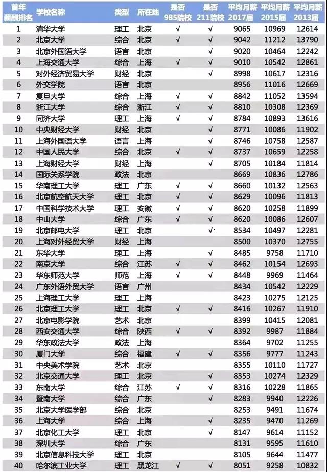 有些知名985高校如:武汉大学,湖南大学,重庆大学等排名比较靠后;但不能表明这些学校的毕业生工作不好,这样的工资水平在当地城市还是有很强竞争力的。