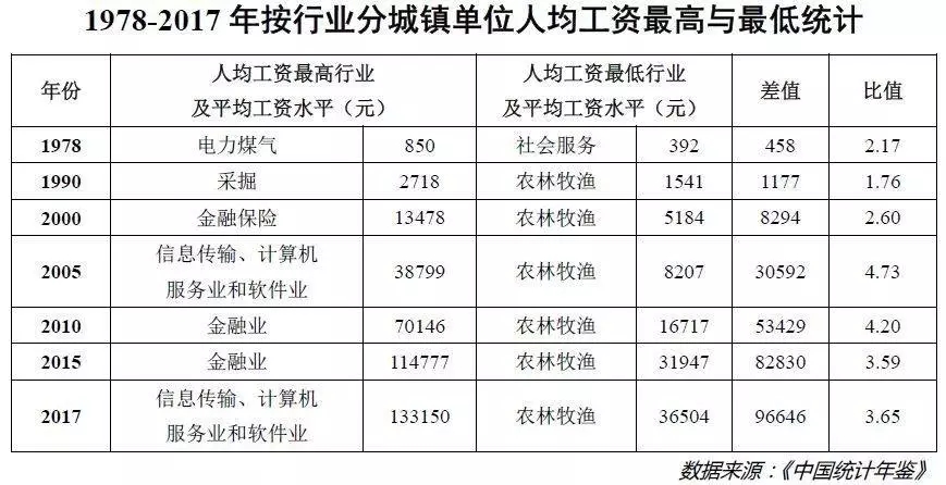 可以看到,从工资差距看,1978年人均工资最高的电力煤气业与人均工资最低的社会服务业的工资差距仅为458元。然而,随着时间的推移,人均工资水平最高与最低行业的差距越拉越大。到了2017年,人均工资水平最高的信息计算机软件业,比人均工资水平最低的农林牧渔业多出96646元,这便意味着一个拿着平均薪资的金融从业者,一年可以比一个农民多赚近10万元,而且这种差距还有继续加大的趋势。