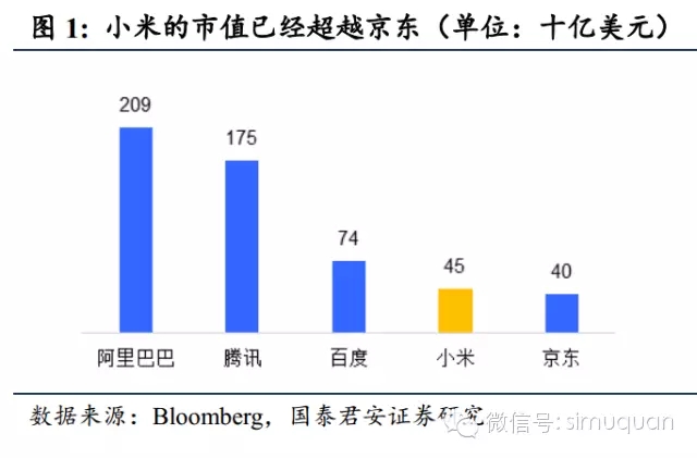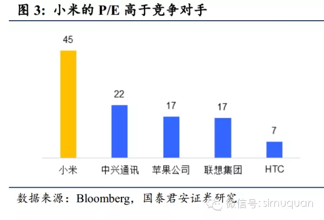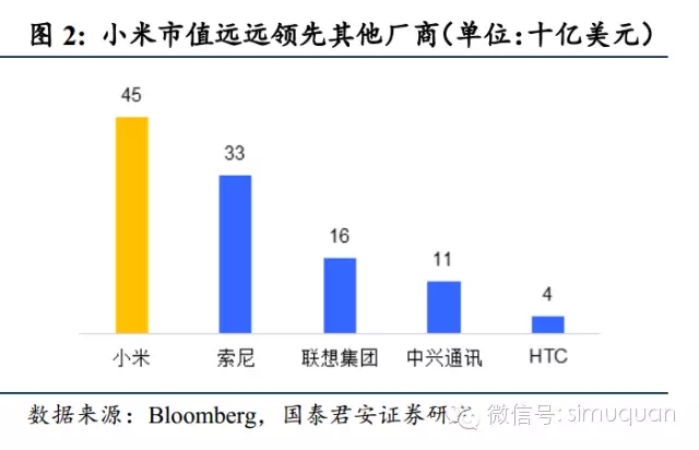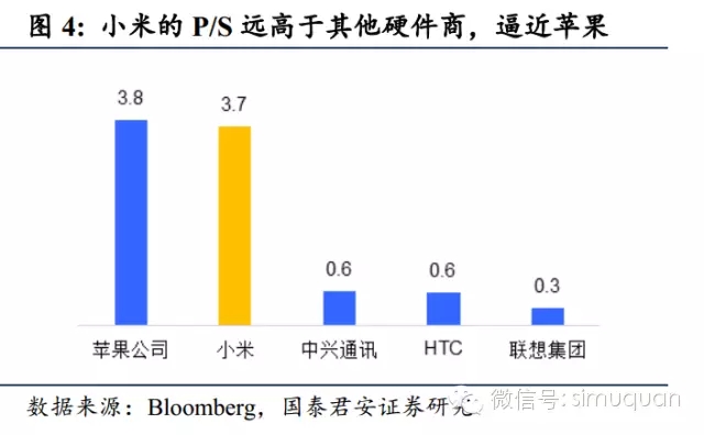 小米向投资者呈现的商业模式是一个美丽的生态系统。小米强调“硬件+软件+服务”三驾马车,MIUI、小米手机、小米路由器、小米盒子等等诸多产品实际上是个一体化的用户生态系统(见国泰君安策略“商业模式系列报告第四篇《软硬一体化,“小”虾”米”玩转大生态》“)。这个系统有一些很好的对标,如苹果、腾讯、阿里巴巴等等。这种生态系统可以牢牢地占据市场中的一席之地,享受稳定增长的盈利能力且不会被轻易地替代。一般的应用级公司差不多能做到十亿美元规模就已经很大了、平台型的公司市值可能达到百亿美元,而真正的大型生态系统级公司往往都可以达到千亿美元级别的市值。各个阶段的投资者(从天使轮到A、B、 C轮..),都会在概率的基础上为这个故事买单。——而他们对硬件厂商只会看盈利。