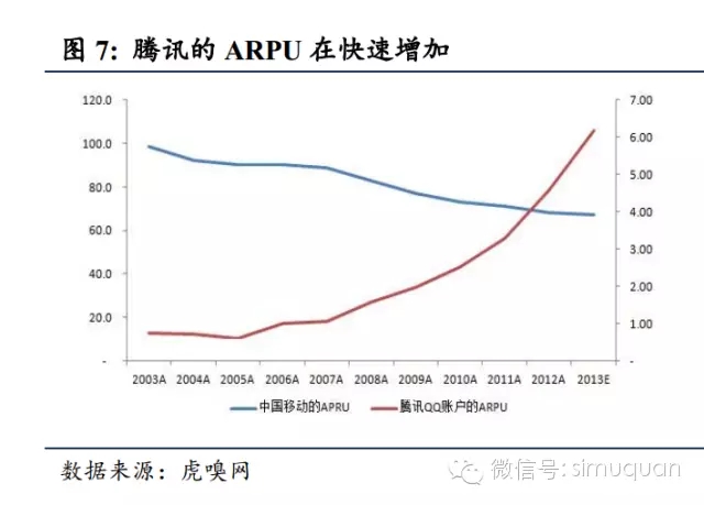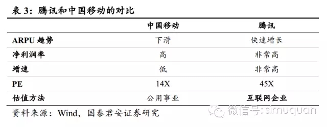 3.腾讯与中国移动的对比说明需要结合企业发展阶段变现能力来看用户数量。投资者在对互联网企业进行投资时,需要进一步考虑在用户数上的变现能力。而决定变现能力的则是企业独特的商业模式。