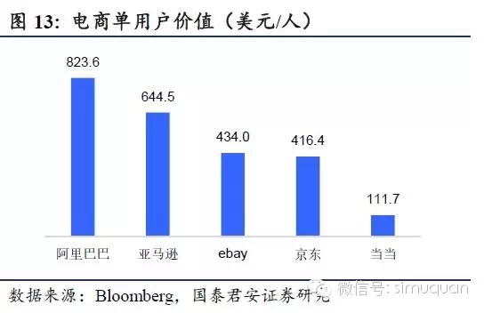 在交易规模的背后是用户规模还有每用户的收入贡献能力。虽然美团的用户是阿里的63.5%,但是其收入贡献能力是阿里的21.3%。