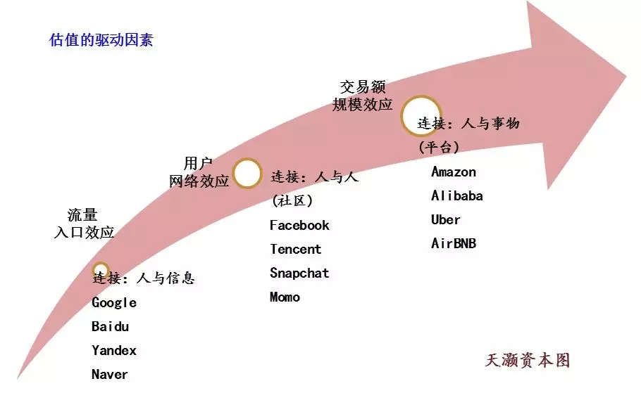 人与事物的链接,有早有携程,京东,阿里, 现有美团,滴滴等。这三件事是三种不同的商业模式,他们的估值体系也因而不一样。