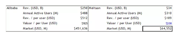 所以我们将阿里巴巴的每用户估值给予一定的折价,以此作为美团的每用户的估值 (Value/per user), 我们得出估值645亿美元。
