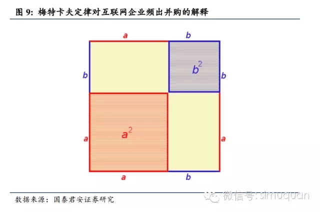 4.Facebook收购WhatsApp:由于梅特卡夫定律所提示的网络的规模效应,收购方可以在支付较高的溢价下仍然与被收购方取得共赢。梅特卡夫定律提出,网络的价值和网络节点中用户的平方数成正比。收购方和被收购方取得共赢。收购方往往愿意支付一个较高的溢价。人们为其他互联网公司估值时,会更愿意遵照这种已经含有溢价的“锚”来估值。