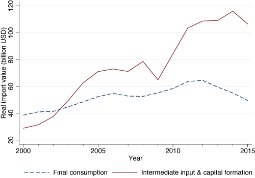 Rising imports from China and trade issues in JapanAs in the US, Chinese imports to Japan have increased dramatically, and account for a quarter of its imports. Figure 1 shows Japanese imports from China over the past ten years, based on the RIETI Trade Industry Database 2015, which classifies trade data into each production stage. The two curves in the figure indicate whether the imported goods were used as intermediate/capital goods or for final consumption.