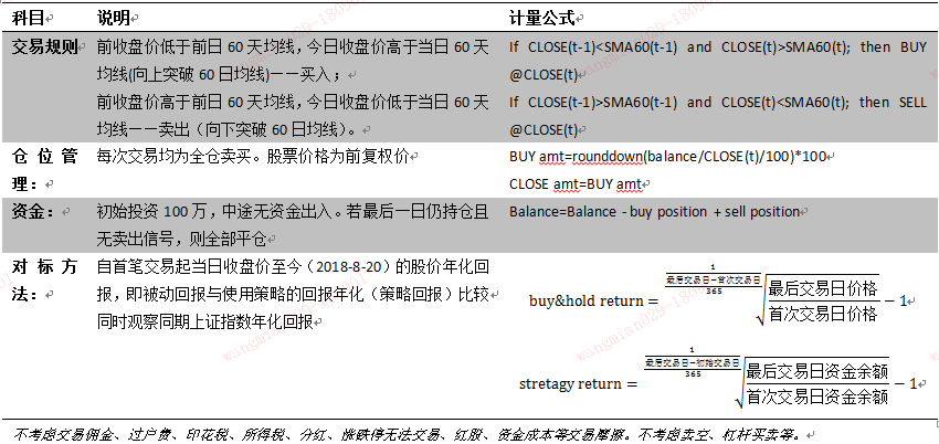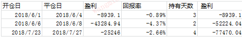成都银行601838.SH于2018年1月31日上市,三个月后的2018-6-1开始第一笔交易,持仓至2018-6-4(3天),盈利-8939,交易回报率(return=profit/last balance)-0.89%。此后交易2次.三次交易均为亏损。从股票价格时序图例来看的确没有明显的上行趋势。(新股上市后会有较大上涨,但60日均线至少在第60天才出现。考虑到打新中签的低概率,在回溯中,我们从第一次交易为开始日,计量策略回报&被动回报)