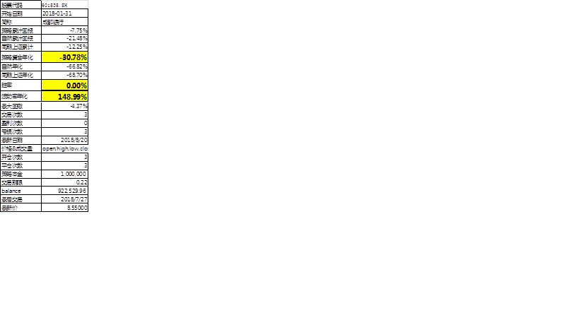 以【成都银行601838.SH】为例:成都银行自2018-1-31上市至今(2018-8-20,下同)的0.22年中,初始投资金额1,000,000.00元,累计完成三次交易。最大回撤-4.37%,累计盈利-138633.18元。期末金额922,529.96。第一笔买入(2018-6-1)至今,策略累计回报-7.75%,年化后-30.78%,同期被动累计回报-21.48%,年化后-66.82%。