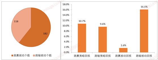 三、 策略交易跑赢被动回报的股票个数并不明显占优。跑输策略个股的被动回报较高。