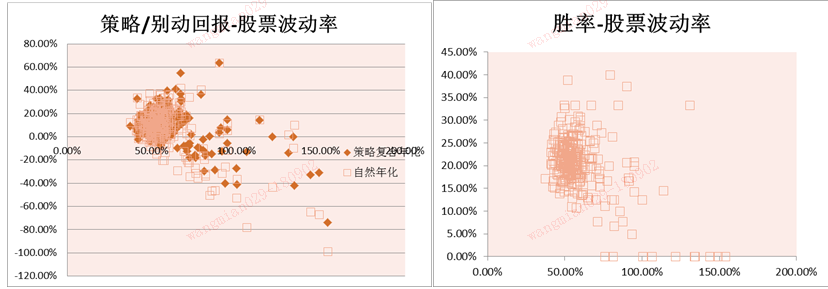 根据股票每日波动计算其年化波动率(风险)后显示,股票回报(策略&被动)与其波动呈现了经典的“组合理论”图像。即高波动伴随着高收益/高损失。同一风险水平中,策略回报重心相对被动回报来说略高一点(策略跑赢回报的结论)。同时、在同一风险水平中、会出现不同的回报表现。侧面亦说明趋势跟踪策略在交易时对风险管理是有贡献的(“截断亏损、让盈利奔跑”)。同时,我们没有发现波动跟胜率的强相关。