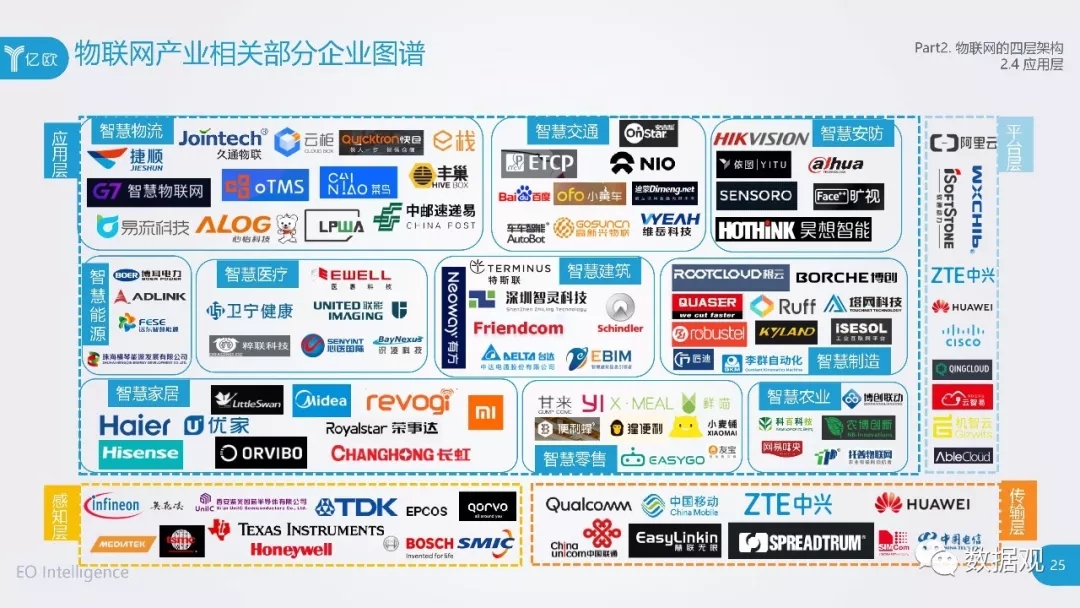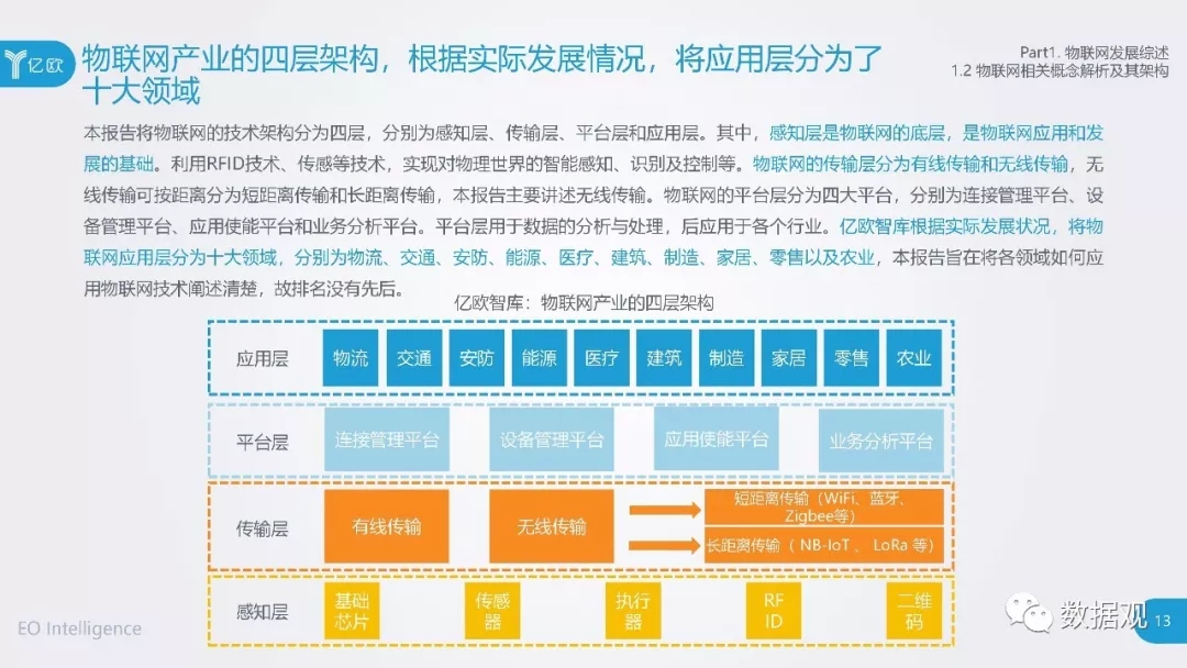 近日,亿欧智库发布《2018中国物联网应用研究报告——概念、架构及行业梳理》,以物联网产业发展背景出发,将物联网的技术架构分为了四层,分别为感知层、传输层、平台层和应用层。