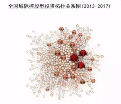 通过数据建立城际投资的全国城市拓扑关系网络,能够看到中国城际产业资本的控制中枢,即以“北上深”为中心的城市网络。