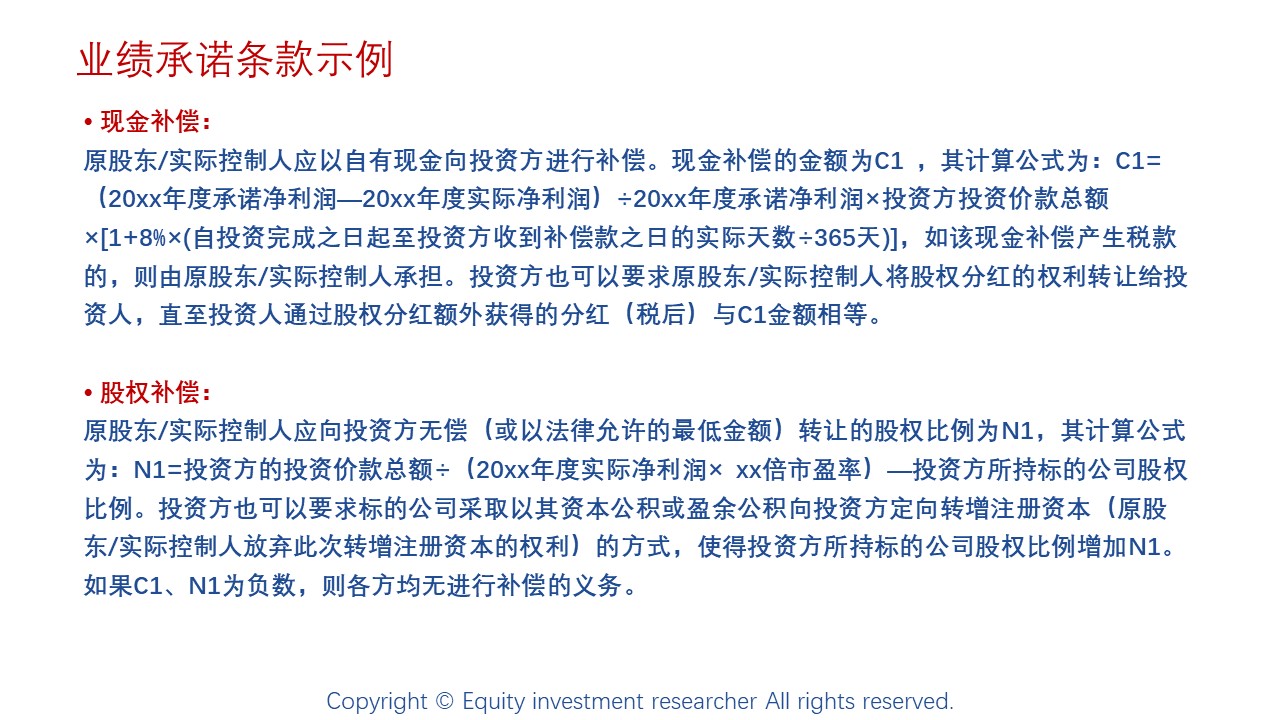 假如一家目标企业投资基准日的投后估值为10亿元,投资人投资1.5亿元,持股比例为:15%,设定标的公司在2019、2020年的扣除非经常性损益后的净利润(以下简称“扣非净利润”)分别为5000万、1亿元,那么可以假设在刚好达到当年度的业绩指标,不考虑其他因素,则约定2019年度的PE倍数=10亿元/5000万,即20倍,同理可得2020年PE倍数为10倍,则对赌条款可参考下列写法:
