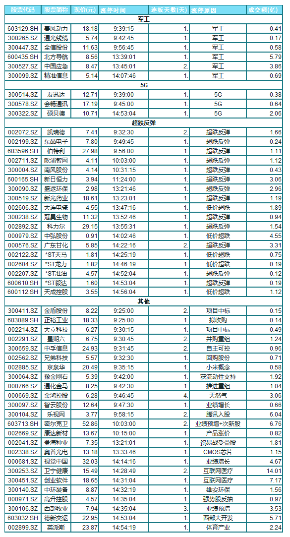 板块方面、截至收盘,航天航空、船舶制造、工艺商品、安防设备、多元金融、交运设备、农牧饲渔、文化传媒、珠宝首饰、交运物流等行业领涨两市,电信运营、木业家具、贵金属、化肥、民航机场、水泥建材、酿酒等行业表现一般;题材概念上,食品安全、北斗导航、航母概念、军民融合、大飞机、智能电视、乡村振兴等概念表现较好,高送转、单抗概念、煤化工、彩票概念、养老金、ST板块、生物疫苗、钛白粉等概念表现落后。总体而言,市场呈现小幅上涨态势,行业板块更是全线上涨。