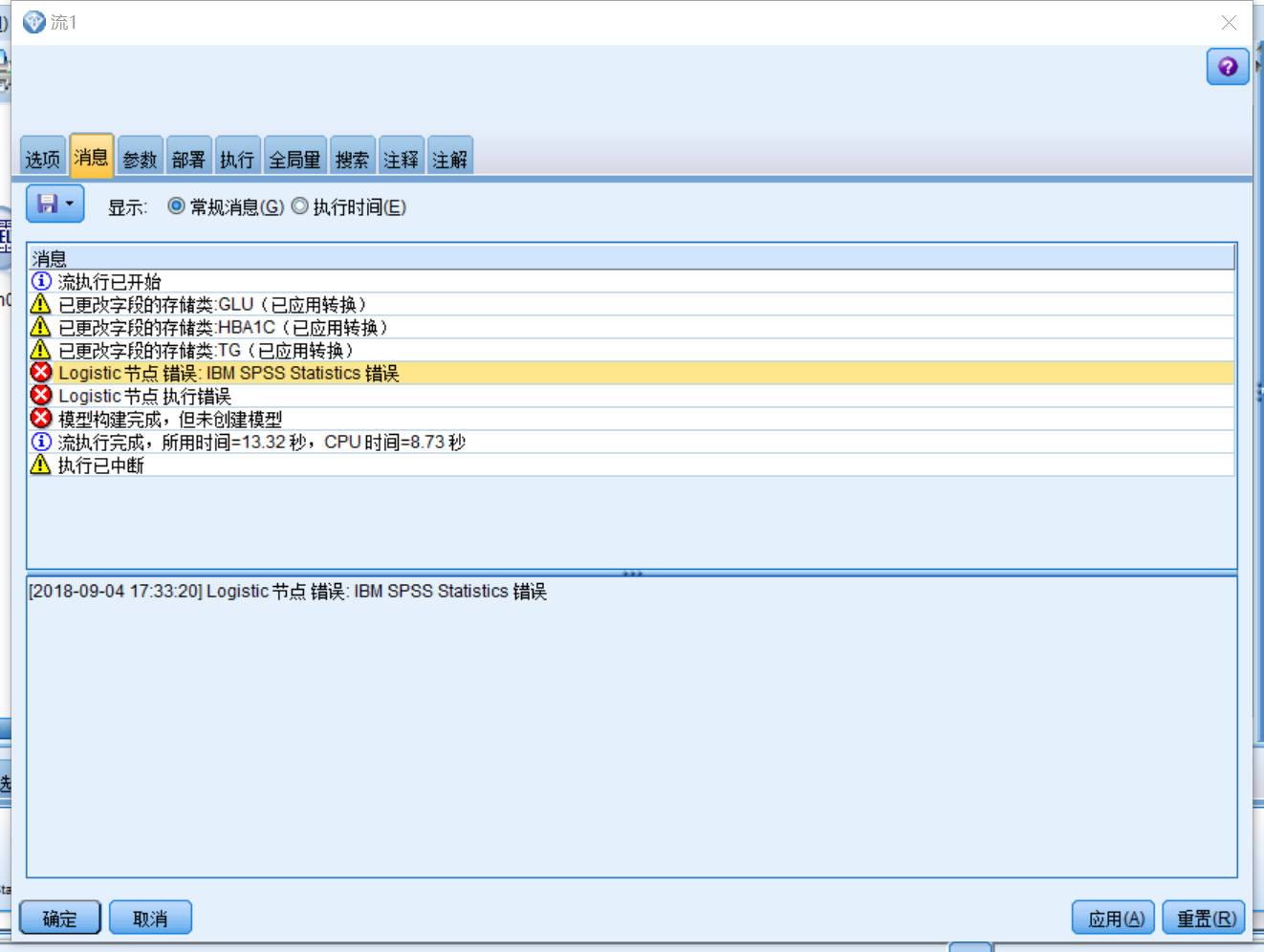 用spssmodeler做logistics回归时提示logistics节点错误:IBM SPSS statistics错误
