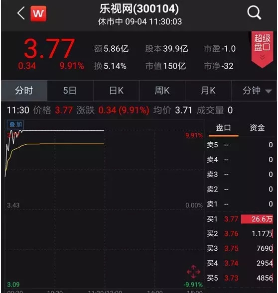 截至今日上午收盘,乐视网股价上涨9.91%涨停,成交额5.86亿元,总市值达到150.4亿元。
