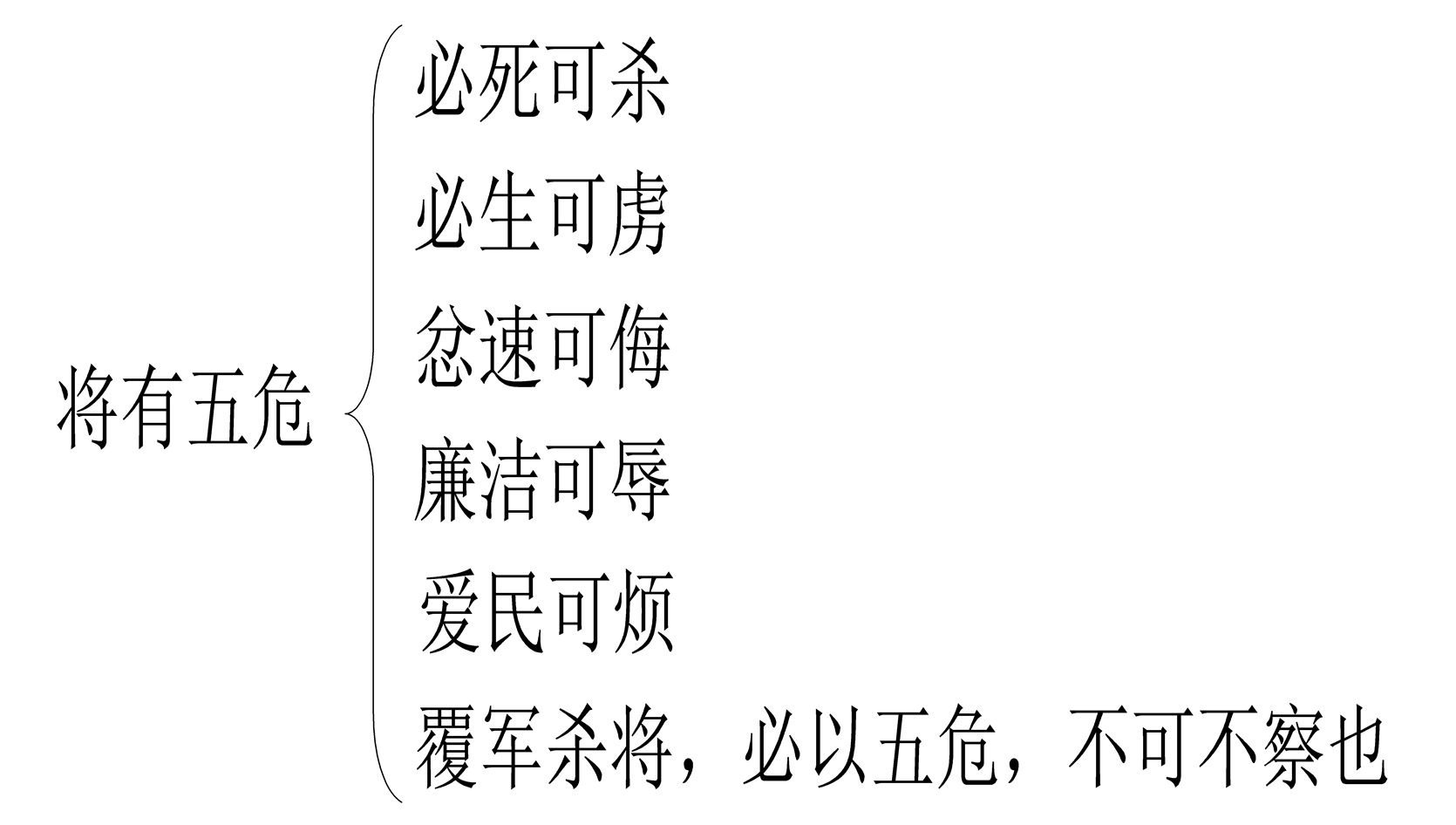 【译文】所以将领有五种致命的弱点:只知死拼会被杀,贪生怕死会被俘,急躁易怒则经不起剌激,廉洁自爱则受不了侮辱,爱护居民则遭受烦劳。这五种危险,是将帅的过错,也是用兵的灾难。军队覆灭、将军被杀,都由于这五种危险引起,是不可不警惕的。